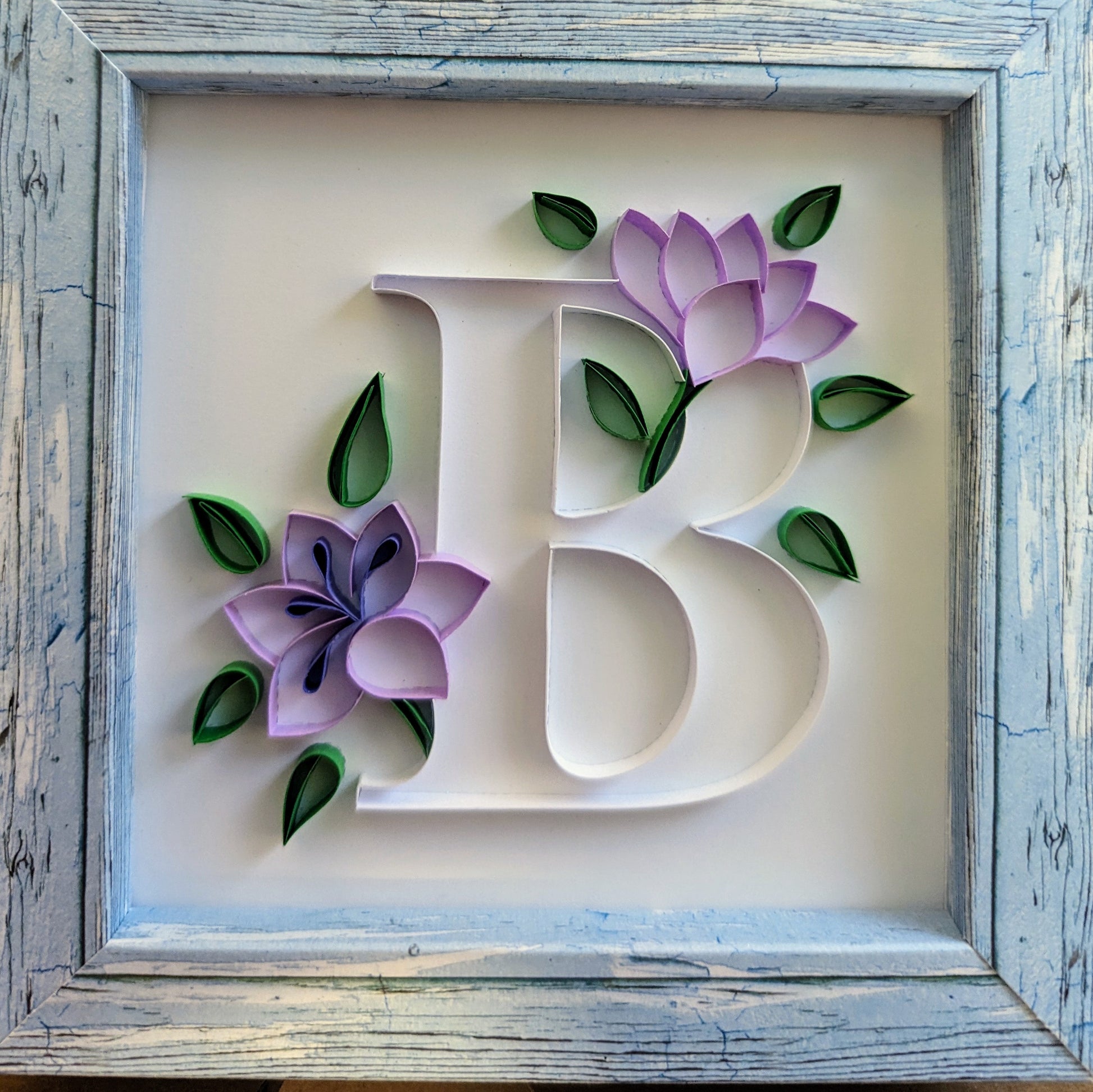 This beautiful paper art monogram was made using quilling techniques. Uniquely designed & 100% handmade. Framed in a cardboard frame measuring 6 x 6 inches.